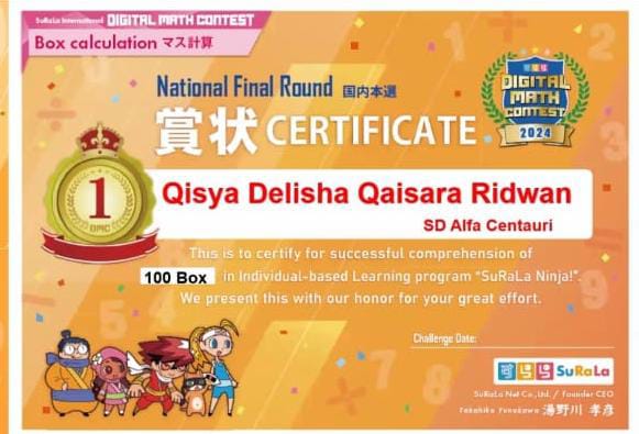 Pada tanggal 02 November 2024 Ananda Qisya Delisha Qaisara Ridwan telah mengikuti lomba Digital Math Contest yang diselenggarakan oleh Surala Indonesia ditingkat Nasional . Alhamdulillah Ananda meraih juara 1 .