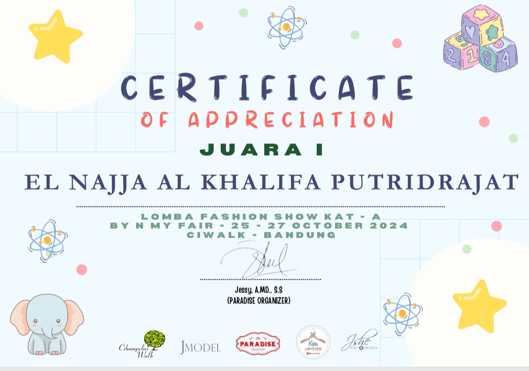 Pada tanggal 27 Oktober 2024 Ananda El Najja Al Khalifa Putridrajat telah mengikuti lomba Lomba Fashion Show yang diselenggarakan oleh BY N MY FAIR Ciwalk ditingkat Kotamadya . Alhamdulillah Ananda meraih juara 1 .